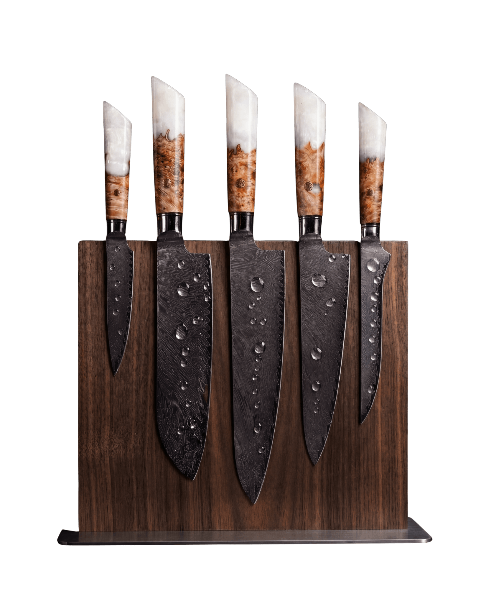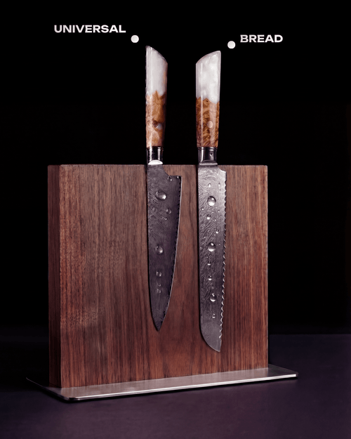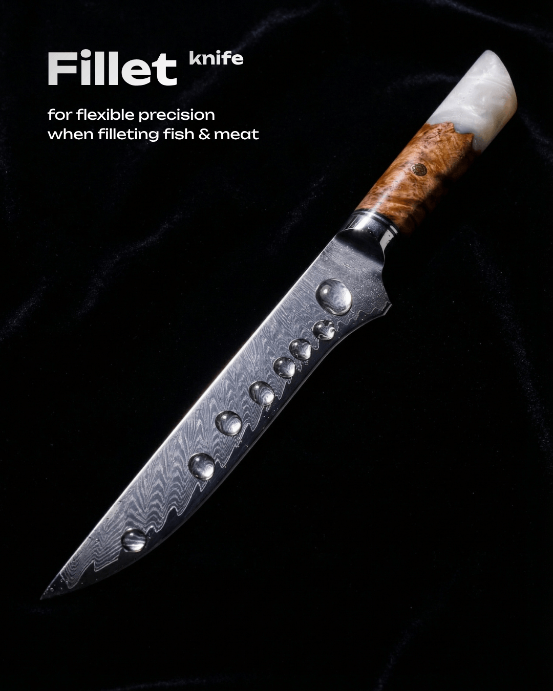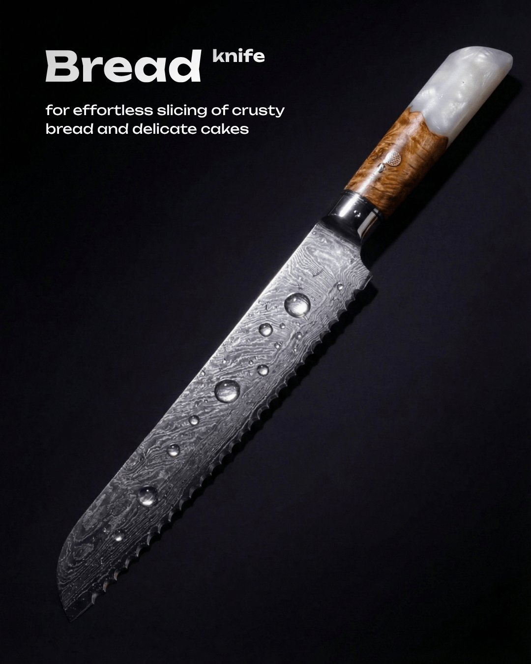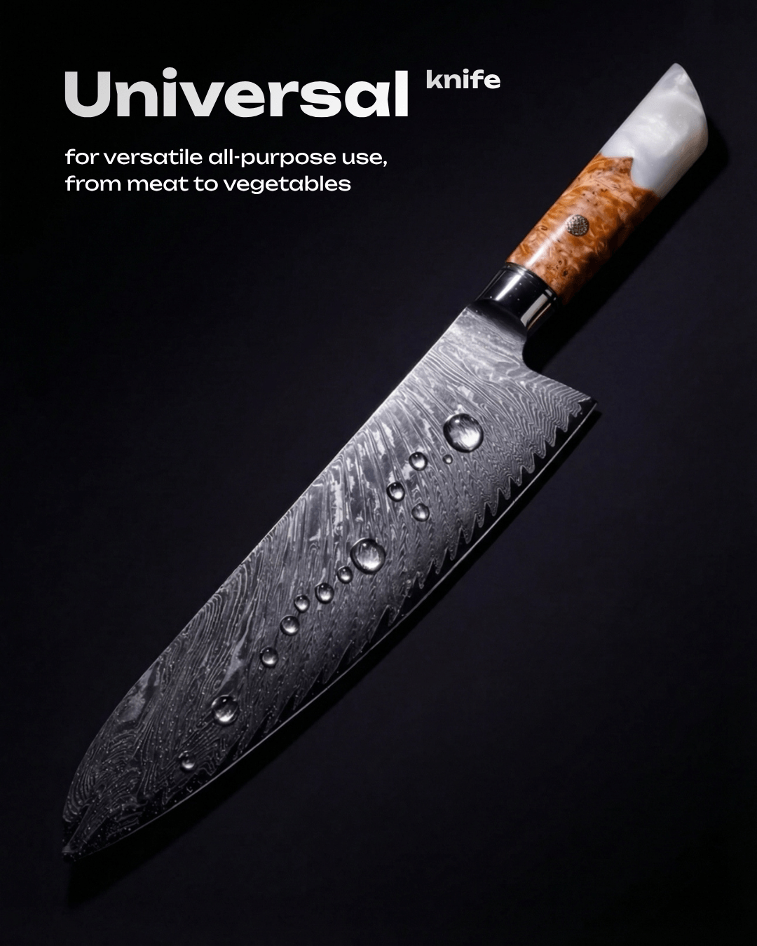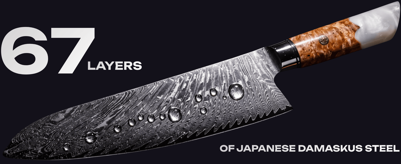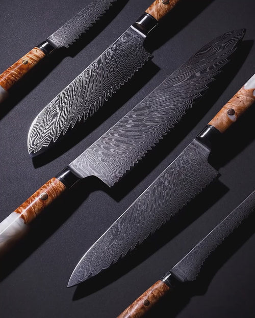 Damascus steel consists of multiple layers of steel forged together, creating exceptional strength, durability, and a distinctive wavy pattern. Our knives feature 67 layers of premium Damascus steel with a VG-10 core, offering superior edge retention and corrosion resistance.